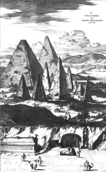 Upon entering his Tertianship at Speier in 1628, he encountered reproductions of hieroglyphs from the Sistine Obelisk in Horwart von Hohenburg's Thesaurus. Throughout his travels and during his tenure in Rome, he sought every opportunity to inspect artifacts and gather information relating to the Pharaonic eras, which he considered the root of all non-Christian culture and religious philosophy. In 1672 a Mssr. De Four excavated and transported a sarcophagus from Memphis to Lyons, from whence he wrote to Kircher asking him to translate the hieroglyphic inscriptions on the casket and on the mummy's wrappings. The result was Sphinx Mystagoga, the last of Kircher's six books on Egyptology. In this volume, Kircher discusses Egyptian burial practices, metempsychosis and reincarnation, and translates the Memphis inscriptions and a number of others according to the principles set out in what was perhaps Kircher's major work, Oedipus Aegyptiacus (3 vols. Rome, 1652-4). Although Kircher had earlier successfully unraveled the Coptic language, he refused to believe the hieroglyphs contained anything of less import than 'the highest mysteries of Divinity'. In spite of the resulting inaccuracies, Kircher's 'symbolic' position continued to hold some authority until Jean Francois Champollion's successful decipherment of the Rosetta Stone at the turn of the 19th century.