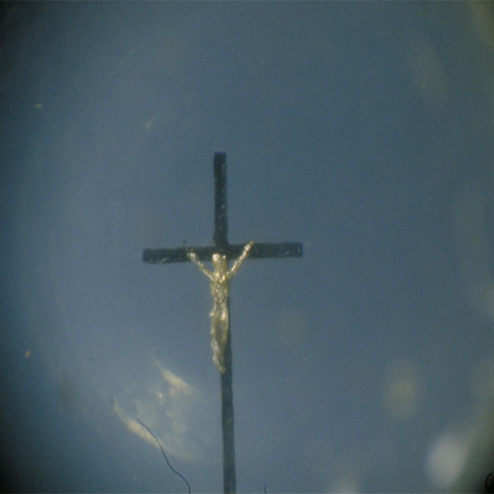 Crucifix The Cross consists of a bisection of a single strand of human hair. The statue of the crucified Christ is made of gold. _________________
